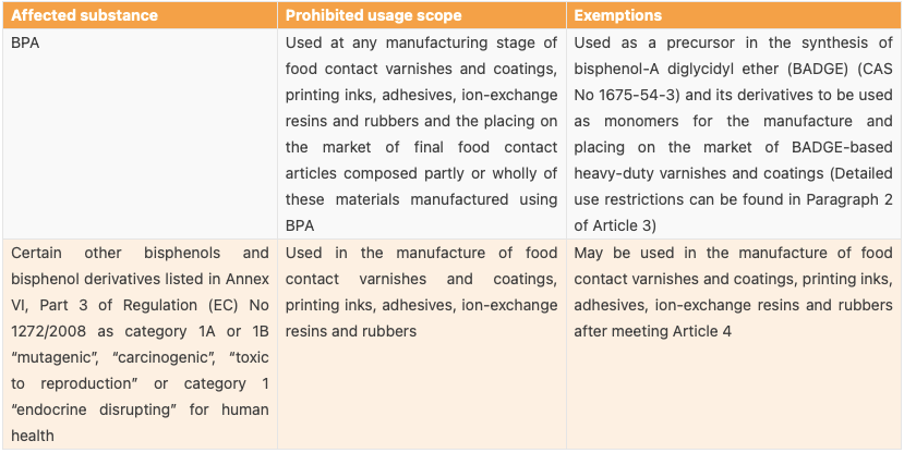 Table 1: Prohibited Usage Scope of BPA and Certain Other Bisphenols as well as the Exemptions