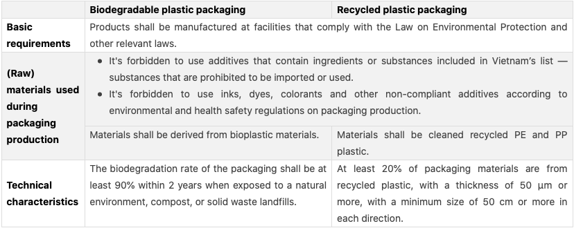 As per the decision, the environmentally friendly plastic packaging mentioned in the criterion refers to biodegradable plastic packaging and recycled plastic packaging manufactured with polyethylene (PE) or polypropylene (PP) plastic as the main raw material, in bag form or film form to cover, contain and protect products’ use value. The criterion covers general criteria and specific criteria for raw material, material used during packaging production, technical characteristics, the maximum limit for pollutants like fluorine, test method as well as the requirements for recovery, recycling, treatment, and disposal. Key requirements are listed in Table 1.